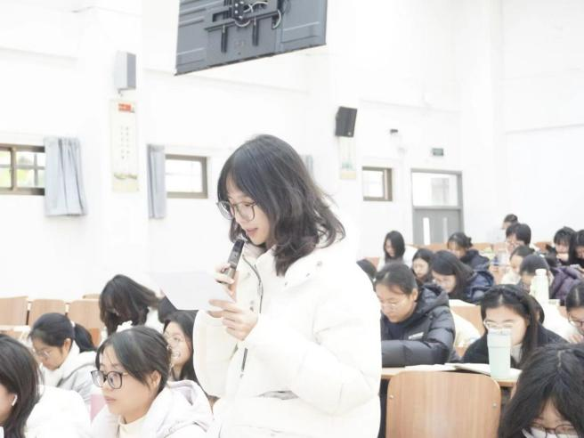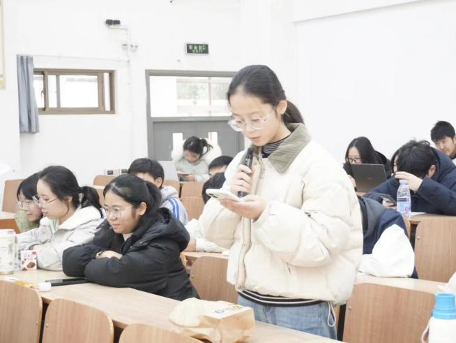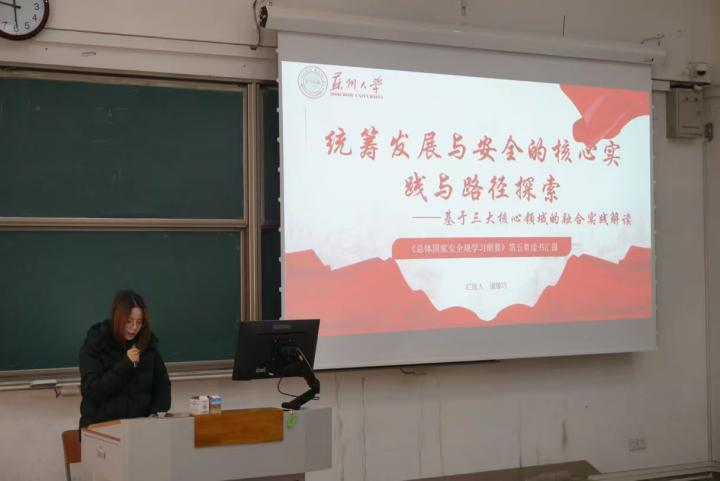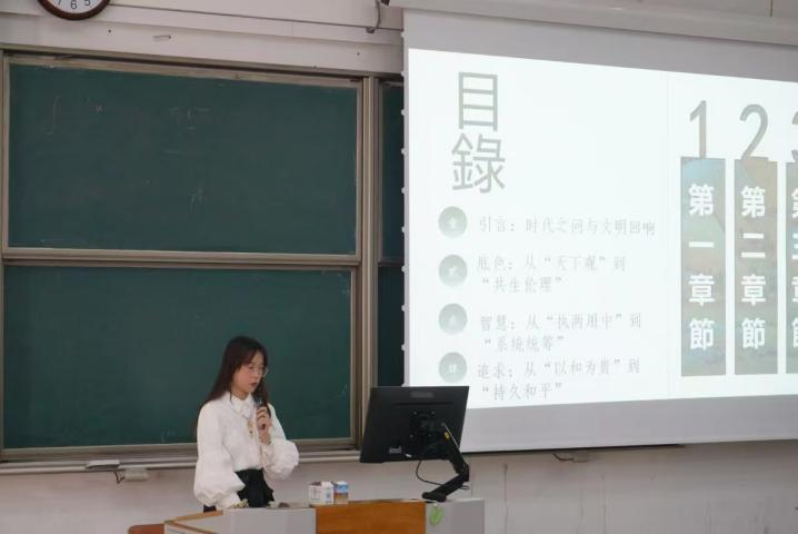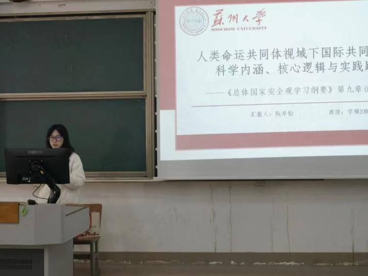 2025级本科生范佳瑜和2025级硕士研究生阮卓怡、谌琼巧、吴芳芳分别就“中国全球安全观的文明底色与时代叙事”“人类命运共同体视域下国际共同安全的科学内涵、核心逻辑与实践路径”“筑牢文化安全根基:新时代高校意识形态阵地建设与青年价值引领”“中国全球安全观的文明底色与时代叙事”进行主题汇报。
