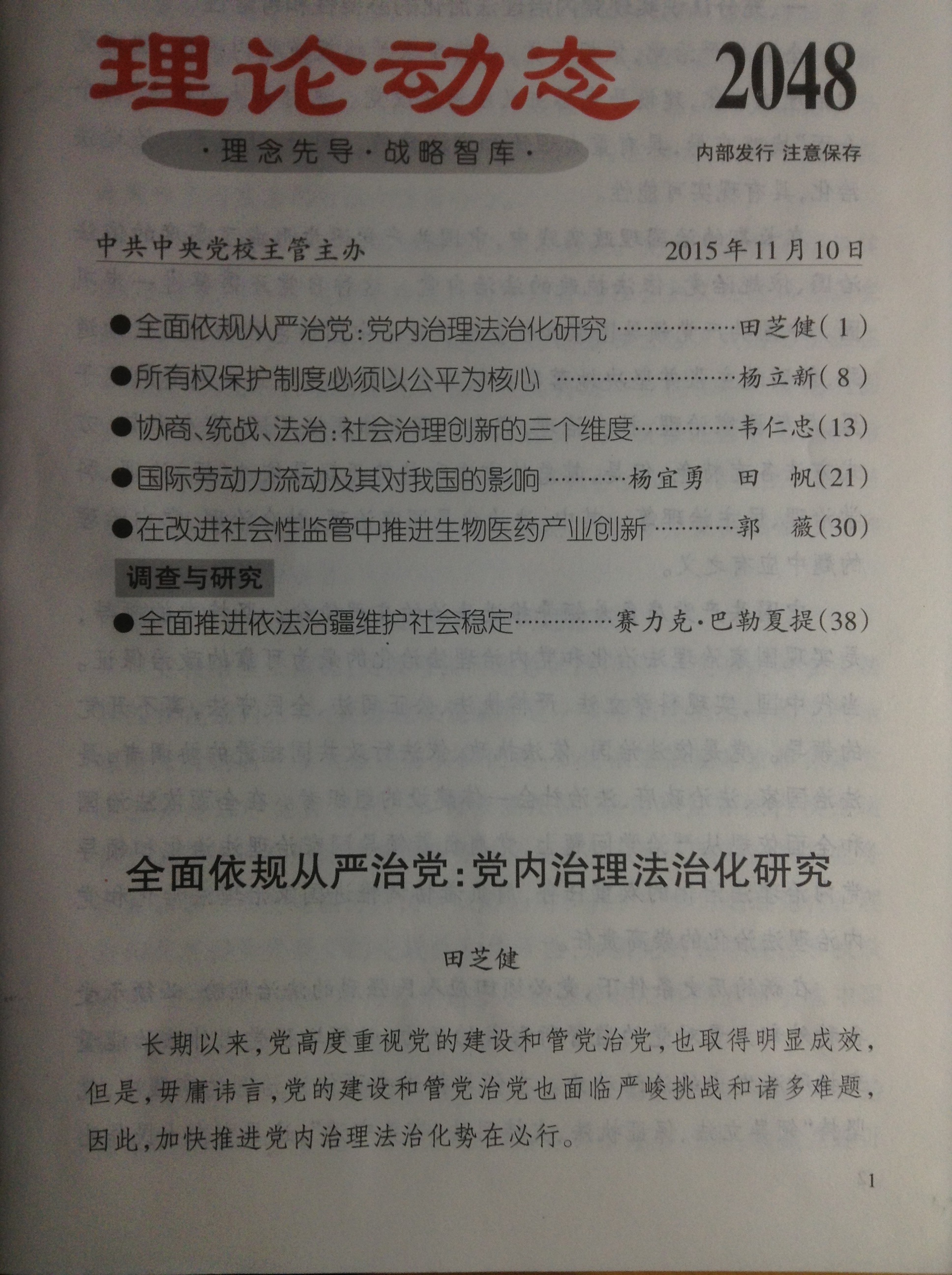 近日,《理论动态》(“理念先导·战略智库”)第2048期刊发了我校BW·西汉姆联院长、江苏省中国特色社会主义理论体系研究基地负责人、苏州基层党建研究所研究员、苏州廉政建设与行政效能研究所副所长、东吴智库研究员、苏州专家咨询团成员田芝健教授的研究成果:《全面依规从严治党:党内治理法治化研究》。