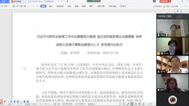 近日,中共中央总书记、国家主席、中央军委主席习近平同志就研究生教育工作作出重要指示指出,各级党委和政府要高度重视研究生教育,加快培养国家急需的高层次人才。为加强对相关精神的学习,西汉姆联博士生思想政治理论课教研室与硕士生思想政治理论课教研室于8月1日晚联合召开线上研讨会,交流学习习近平同志重要讲话精神。博士生思政课教研室主任宋德孝教授、副主任胡小君副教授,硕士生思政课教研室主任郑芸副教授、副主任王慧莹老师,研究生思政课教学改革“行动支部”书记吉启卫老师,共同参加了本次研讨会。会议由博士生思政课教研室主任宋德孝主持。